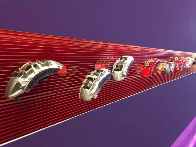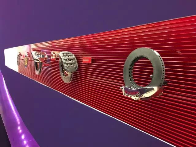说到碳陶瓷刹车,意大利brembo拥有近半个世纪历史的刹车制造商,目前占据世界近60%的刹车市场份额,1984年brembo开始为F1赛车生产碳纤维制动盘,2004年赢得国际“金罗盘”设计奖,brembo碳陶瓷刹车的出现率率先打开了街道车辆进入碳陶瓷轻量化时代,其具有重量轻,抗高温隔热,耐热衰退,刹车反应快,制动距离短等超强制动效果,看到他们的产品犹如进入刹车博物馆,令人心潮澎湃。