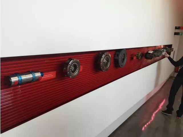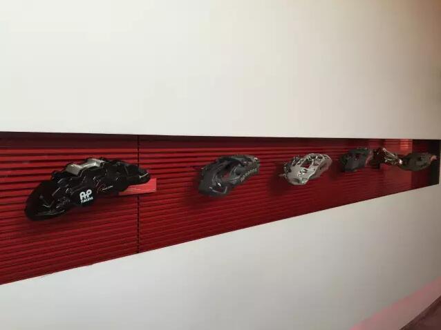 在大楼内部我们参观了brembo产品墙,这面墙上展示了brembo的几乎所有产品,包括刹车碟,刹车卡钳,离合器及代工产品等等。