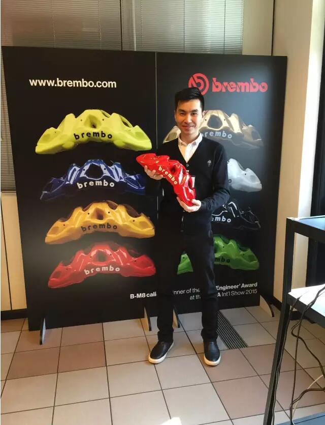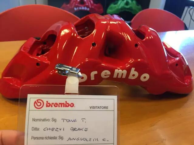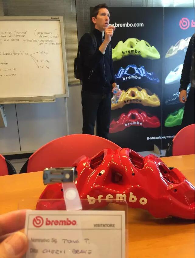 此次受邀到brembo总部拜访,更重要的目的是学习brembo的产品知识。拜访进入到高潮部分时brembo北美分公司董事长Jamie先生,热情洋溢的给我们给我们介绍了2016年最新款的B-M8卡钳。我们有幸见到了全球第一只M8卡钳,Jaime先生说这个产品对他们意义非凡,至此M8刹车将面向全球发售。