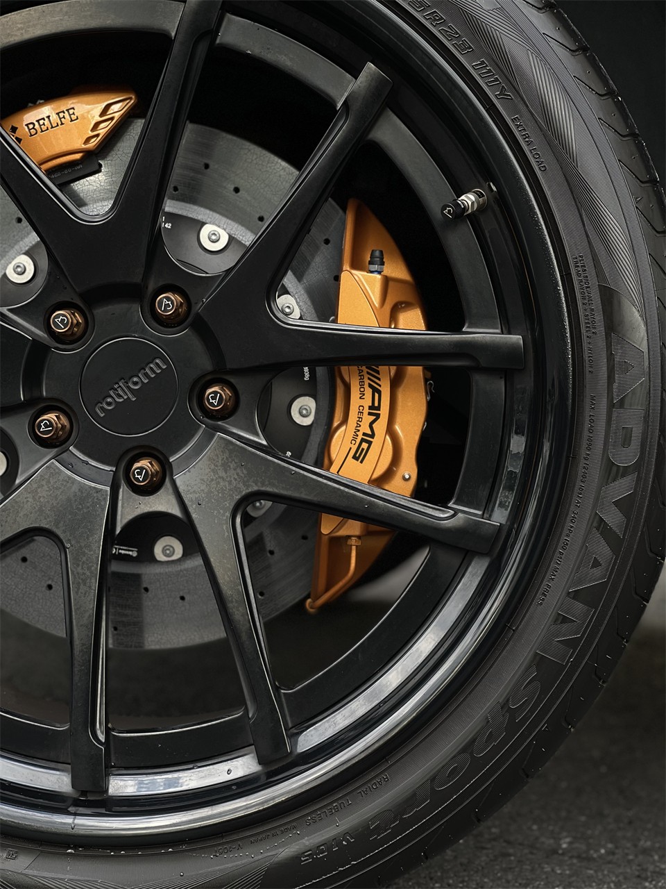 奔驰G63搭载一台4.0T V8双涡轮增压引擎,最大马力585匹。只需要4.5秒,强悍的动力就能将这部2.6吨重的性能猛兽推到100km/h时速。作为顶级玩具,原厂刹车已经有足够出色的性能,但对于有着更高追求的车主而言,依然还有升级空间,比如:前十后四原厂碳陶刹车套件。